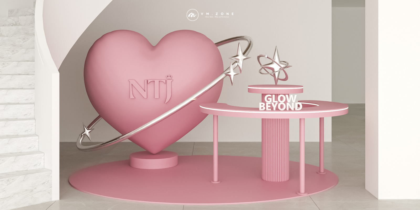 Trước khi những viên gạch đầu tiên được đặt xuống, đội ngũ thiết kế của VM Zone đã phát triển bản vẽ 3D chi tiết. Điểm nhấn trung tâm là Trái tim hồng khổng lồ – biểu tượng cho tình yêu và sự trân trọng mà Ngọc Thẩm Jewelry dành cho phái đẹp. Các dải sao bao quanh không chỉ trang trí mà còn tượng trưng cho sự tỏa sáng của những món trang sức đá quý.