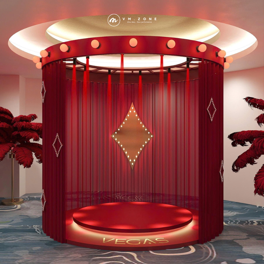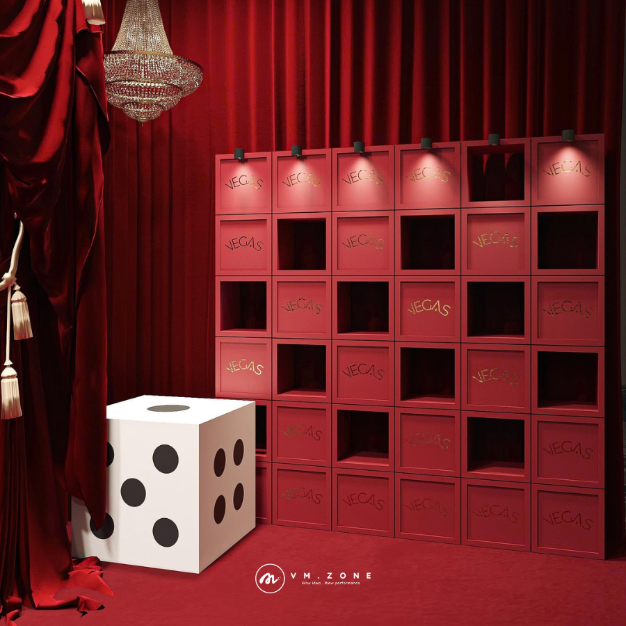 Hệ thống Backdrop Layering với những dải rèm nhung được thắt bím thủ công cùng tua rua vàng tinh xảo, tạo nên khung hình có chiều sâu như một sân khấu thực thụ. Các món nội thất điểm nhấn như chiếc ghế armchair tân cổ điển phối hợp cùng bàn trà nến lung linh không chỉ để ngồi, mà là đạo cụ hoàn hảo để khách tham dự có những bức ảnh "triệu view". Khu vực trưng bày mang tên "Vegas" với hệ thống ô kệ âm tường và ánh sáng điểm, giúp làm nổi bật logo thương hiệu một cách tinh tế và thu hút nhất.