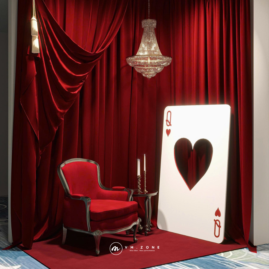 Những khối xúc xắc trắng muốt, tối giản nhưng mạnh mẽ, giúp phá vỡ sự mềm mại của rèm nhung, tạo nên nét hiện đại, đầy tính sắp đặt cho khu vực chụp ảnh. Đặc biệt, hình ảnh lá bài The Queen of Hearts được thiết kế theo phong cách tối giản với đường cắt nghệ thuật không chỉ là một đạo cụ trang trí, mà còn là một tác phẩm điêu khắc ấn tượng, biến vật dụng giải trí thành điểm nhấn nghệ thuật độc đáo.