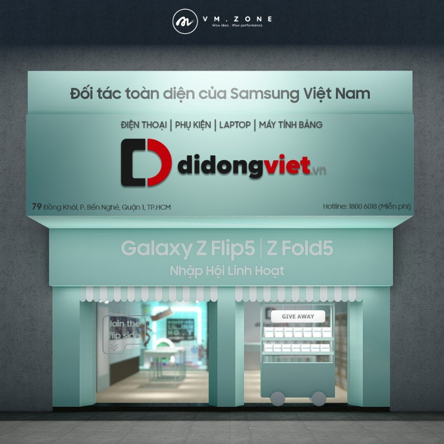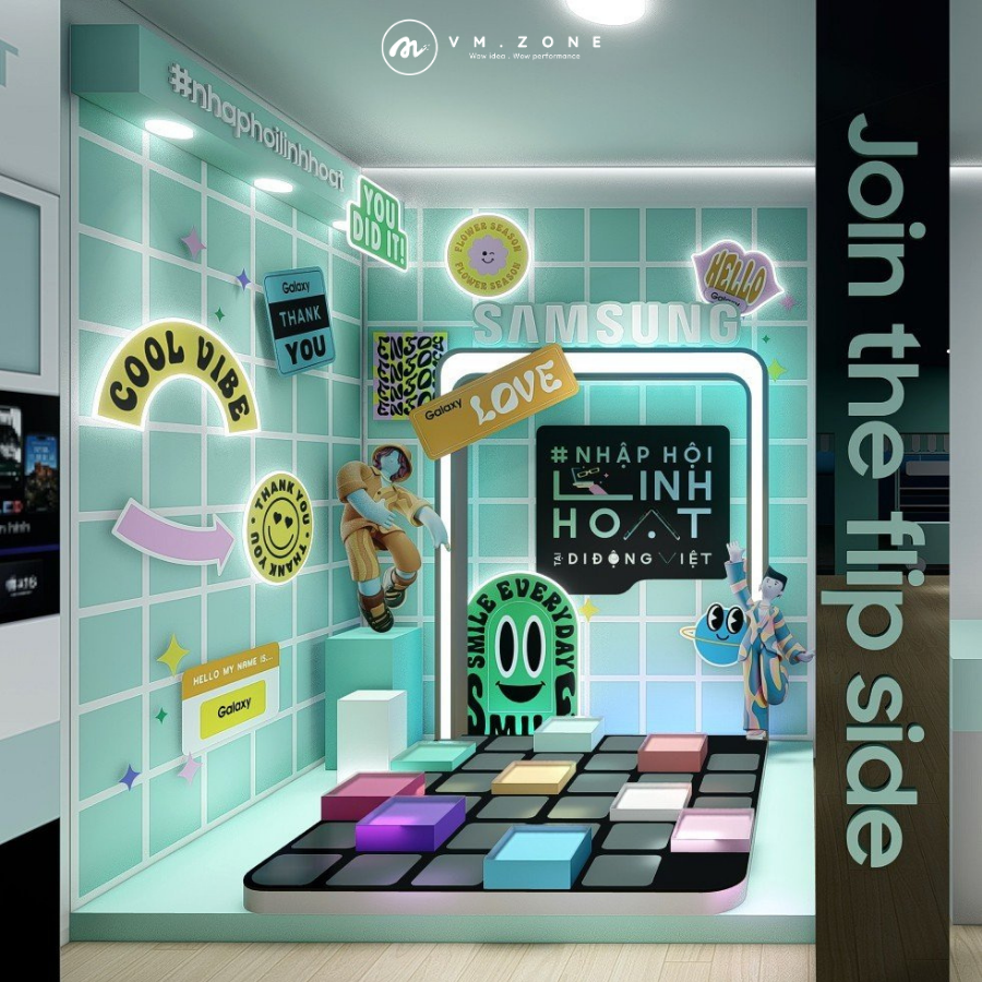 Với vai trò Visual Merchandising & Event Design, VMZONE không chỉ dừng lại ở việc thiết kế. Đội ngũ đã tham gia toàn bộ hành trình – từ ý tưởng ban đầu, dựng 3D, lựa chọn vật liệu, đến thi công thực tế – để đảm bảo mỗi chi tiết đều phản ánh đúng tinh thần “linh hoạt” mà Samsung và Didongviet hướng tới.