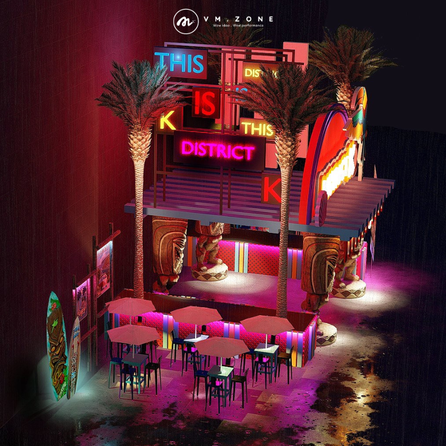 Ý tưởng thiết kế chủ đạo của District K dựa trên sự đối lập (Contrast) mạnh mẽ giữa thiên nhiên nguyên bản và hơi thở Cyberpunk hiện đại. Đây là phong cách Tropical Noir – nơi bóng tối không dùng để che giấu, mà để làm nền cho những sắc thái rực rỡ nhất tỏa sáng.